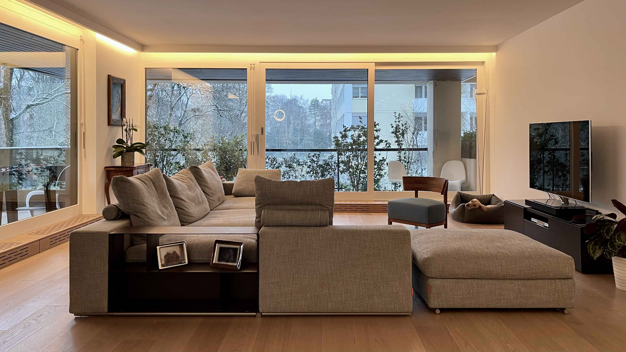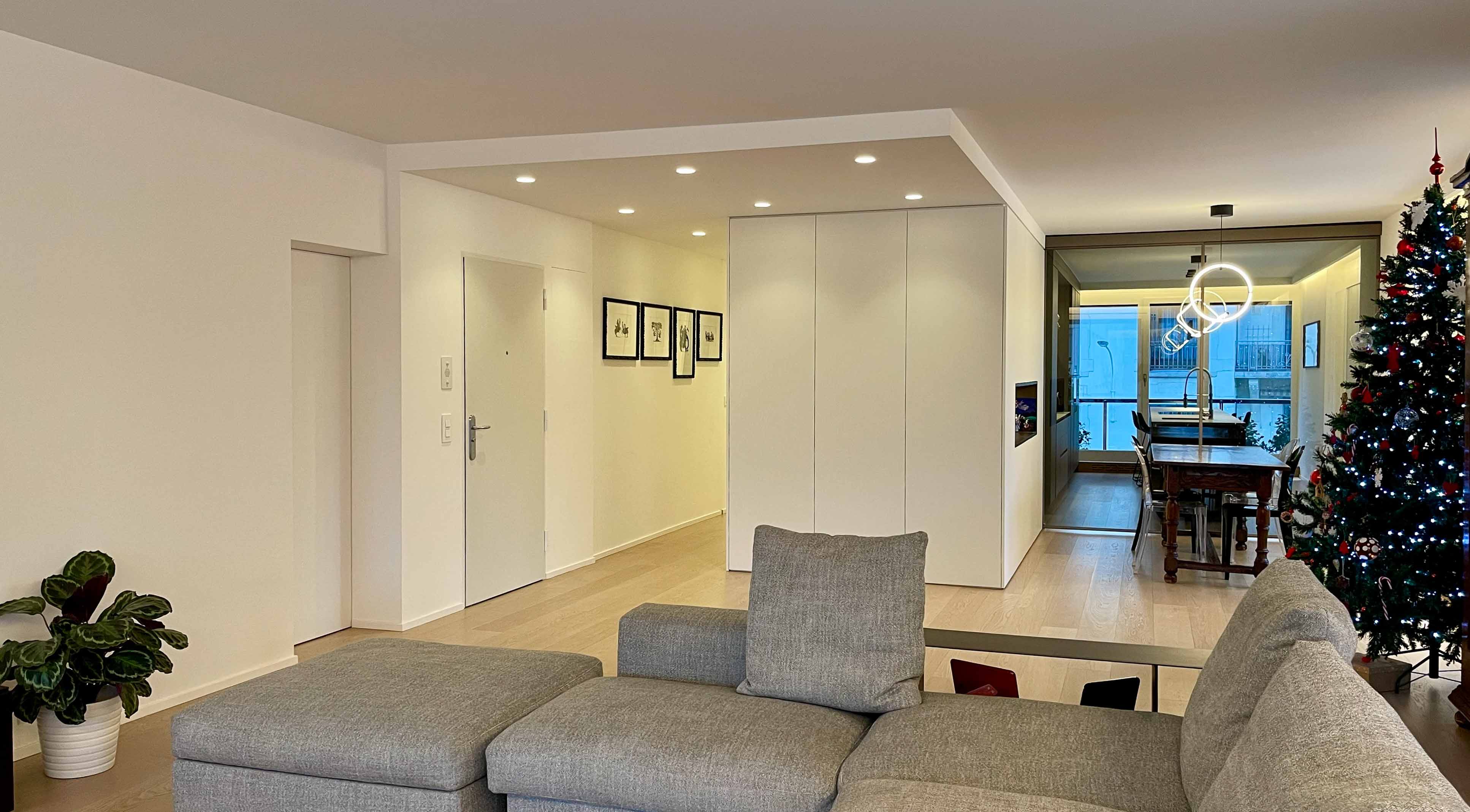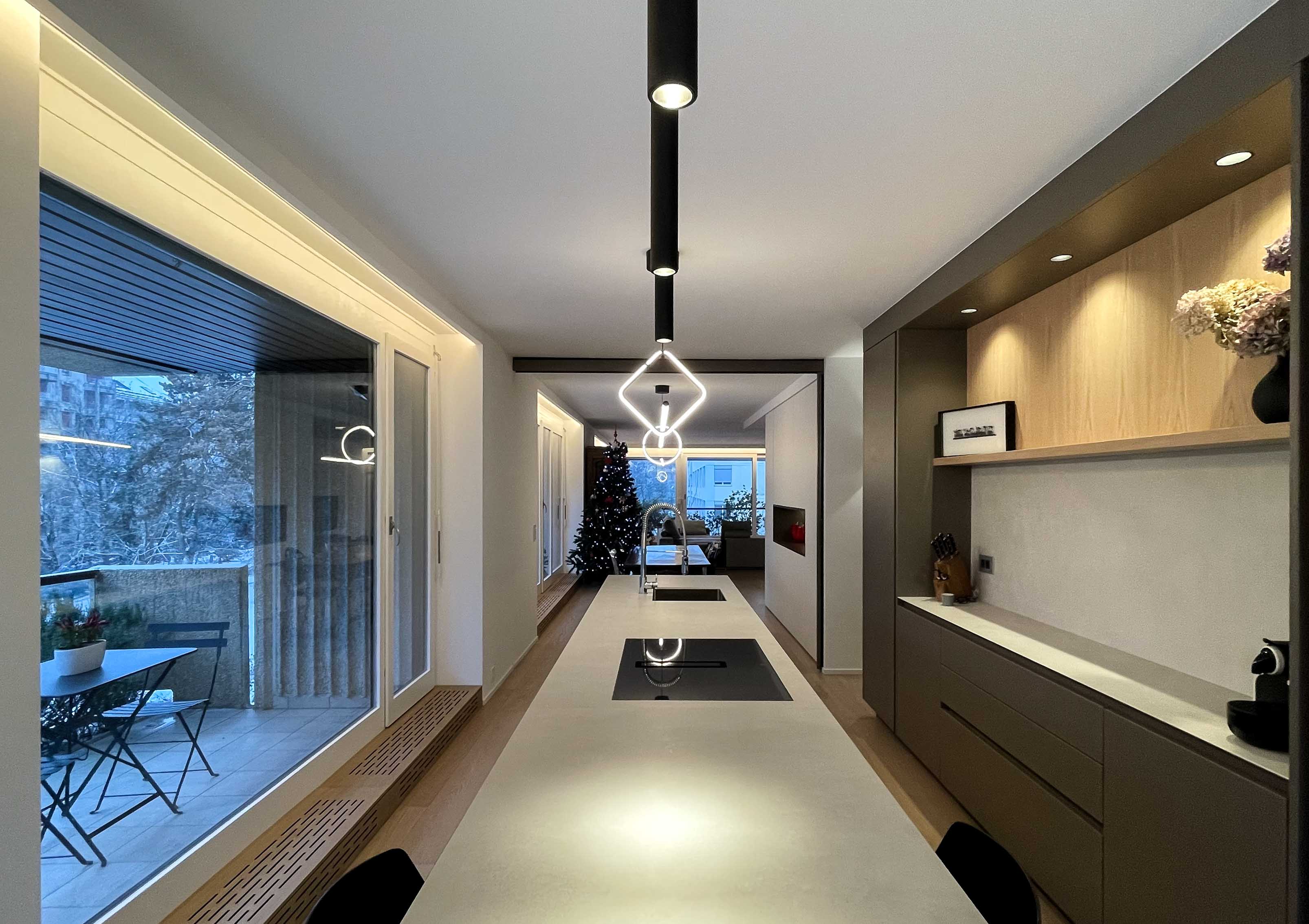 Cette transformation et rénovation complète intérieure a permis de redéfinir les espaces afin d’ajouter 2 chambres à coucher (4 au total), et de créer une nouvelle cuisine « ilôt » ouverte sur l’espace repas et le séjour en favorisant la transparence, la lumière et la relation aux prolongements extérieurs (la cuisine est reliée maintenant à un balcon orienté à l’est afin de profiter du soleil du matin).